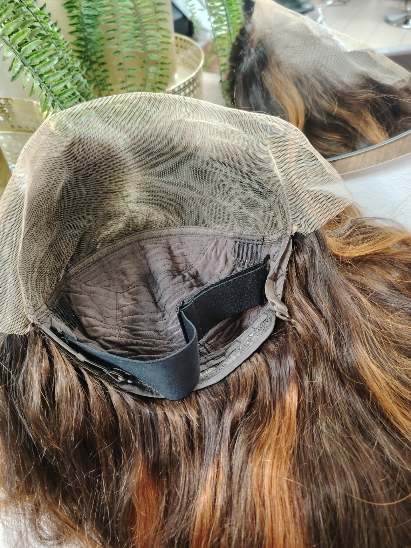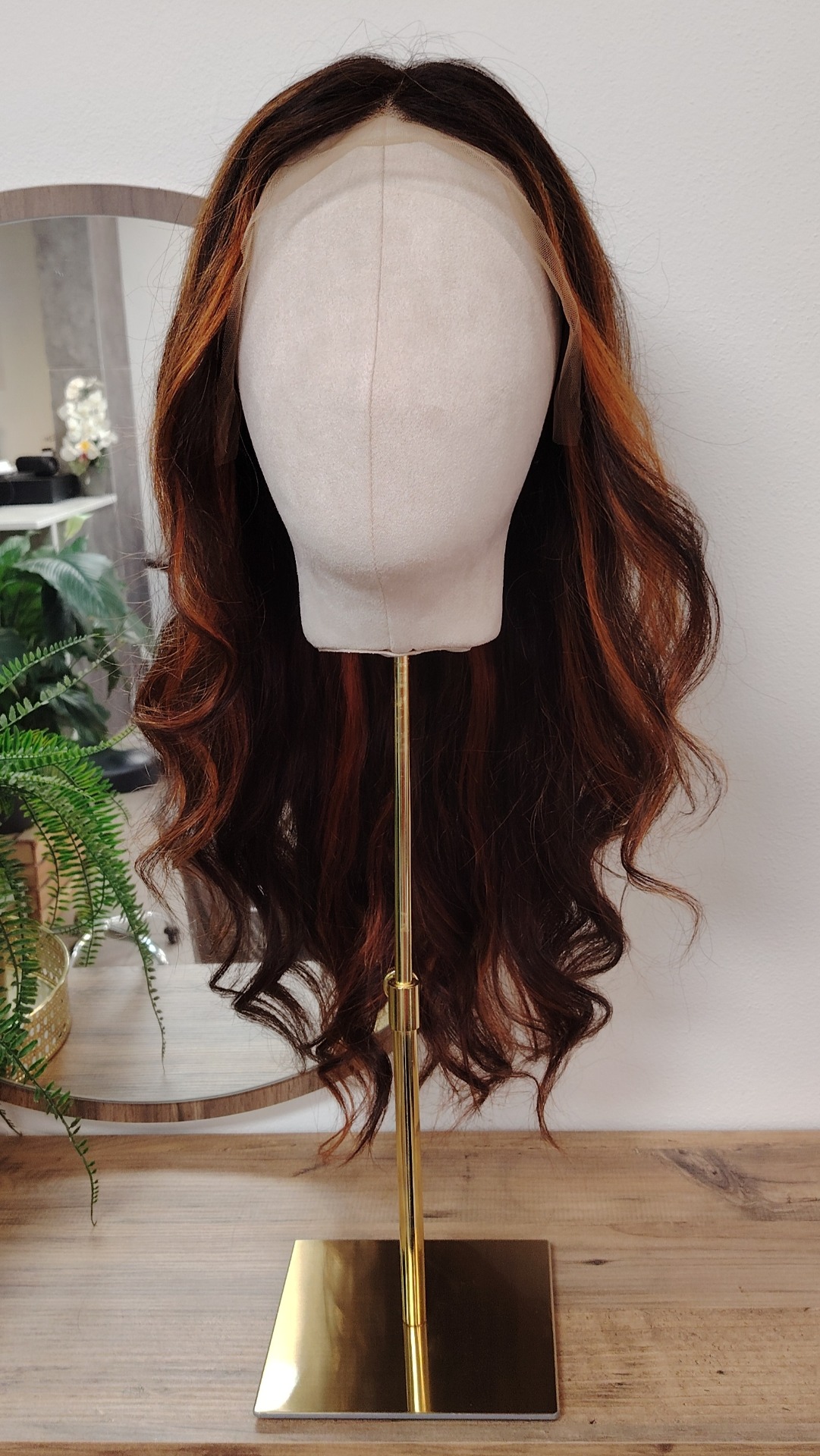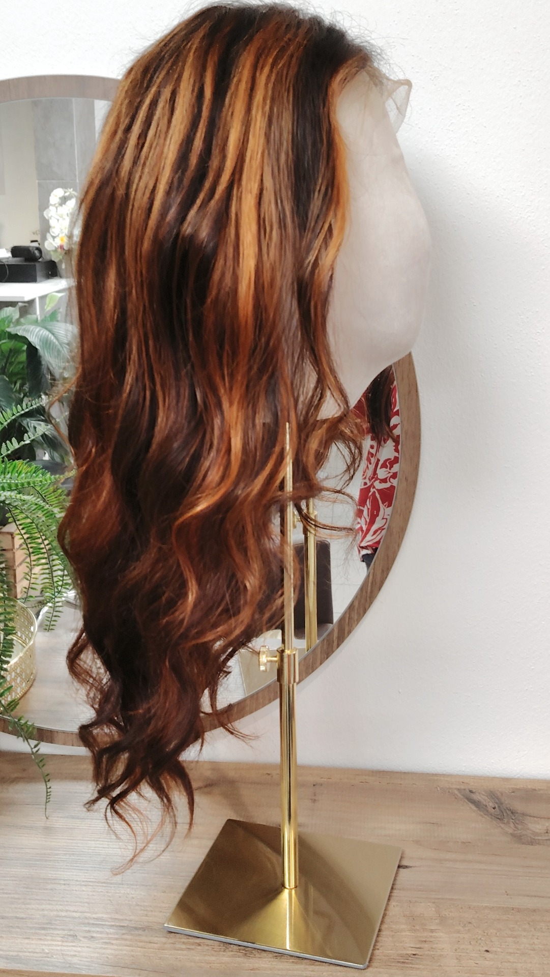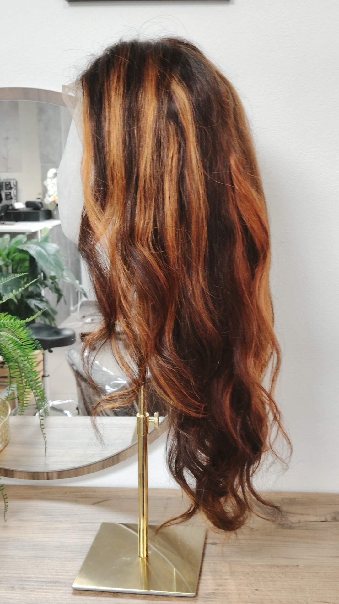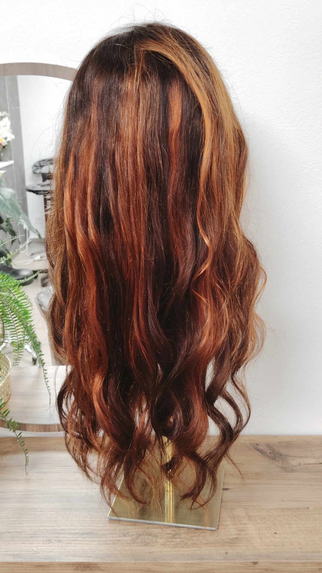 Paruka je ručně zpracovaná, s jemným přechodem barev od tmavě hnědého základu po měděně měděné a karamelové prameny, což vytváří efekt balayage s přirozeným vzhledem.